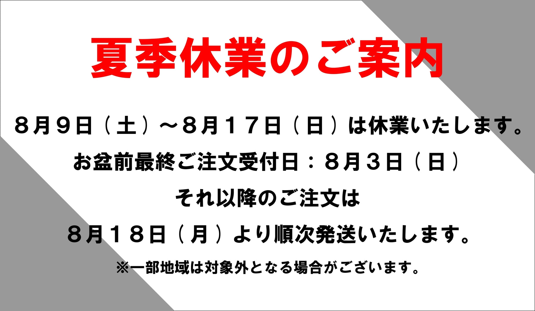 夏季休暇前の最終ご注文受付日は8月3日(日)となります。