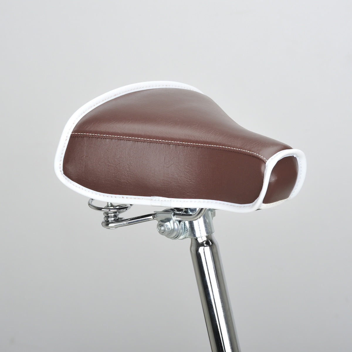 サドルはフチに白いパイピングを施した、かわいらしいデザインを採用。